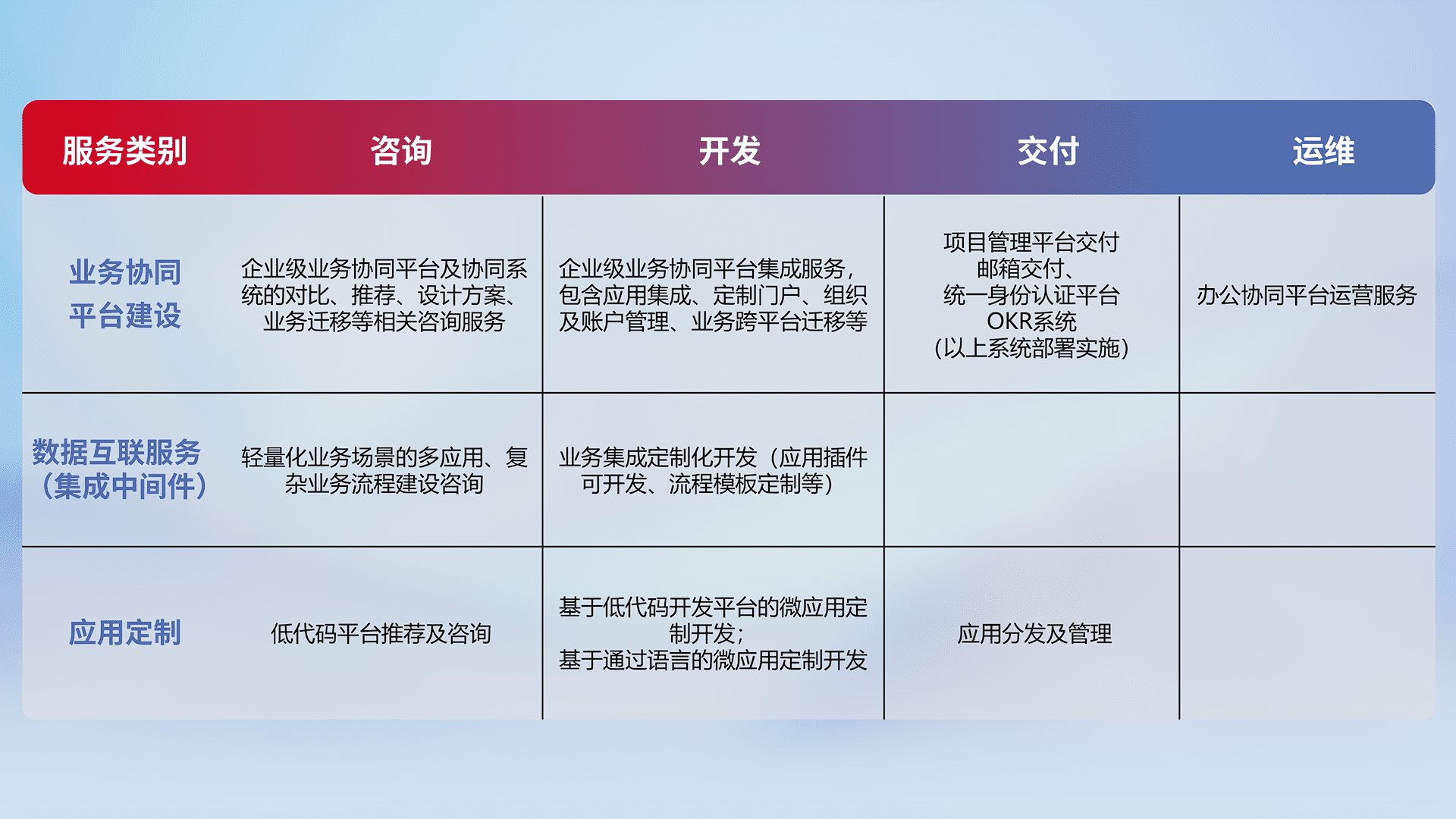针对钉钉、、、企微、、IDaas等平台级产品提供产品的规划、、方案、、、交付、、、定制化开发等服务,,,实现如统一协同办公、、、智能客户服务、、、、混合会议管理、、、、智能数据查询、、等业务场景,,实现数字化转型。。。。